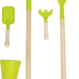 • La boîte comprend un râteau, une pelle, un pot de fleur en plastique, une bêche et un cultivateur.