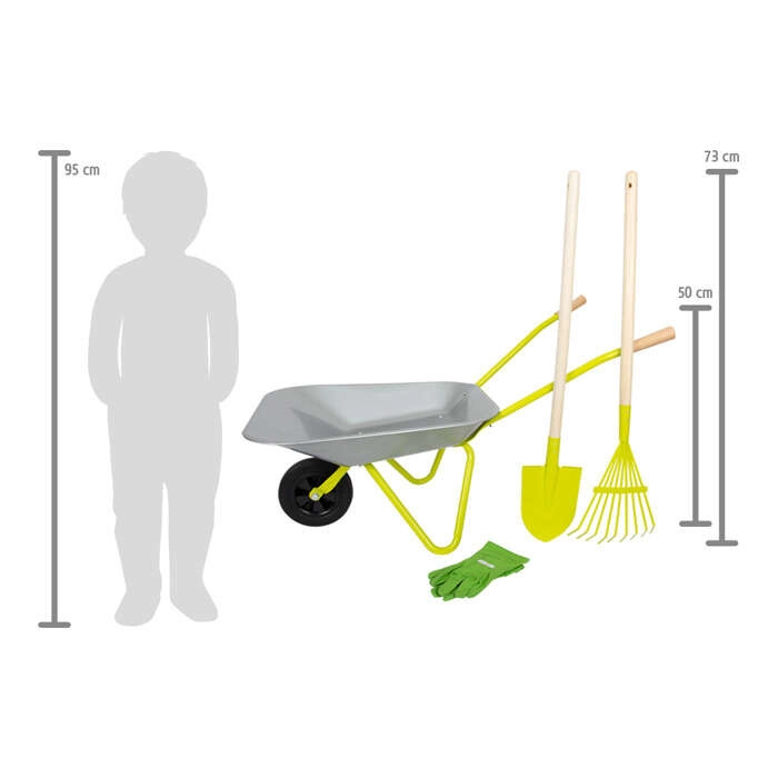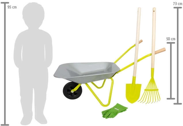 - Dimensions pratiques : brouette env. 79 × 36 × 50 cm, hauteur des poignées 50 cm ; longueur de la pelle et du râteau env. 73 cm.