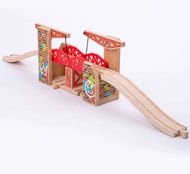 Le pont-levis double de Bigjigs Rail vous permet de lever facilement les deux côtés afin d'offrir suffisamment d'espace pour le passage simultané de deux trains. Ce pont est compatible avec la plupart des autres marques de chemins de fer en bois.