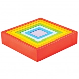 La palette arc‑en‑ciel et les carrés de taille décroissante encouragent l’identification des couleurs, des tailles et des formes. Idéal pour les premiers exercices de tri et de vocabulaire.