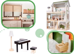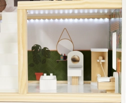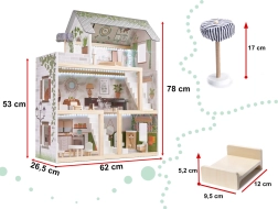 La maison de poupées en bois LULILO Floro est conçue dans un style bohème, ce qui la rend non seulement belle mais aussi fonctionnelle. Avec ses trois étages et sa terrasse spacieuse, elle offre suffisamment d’espace pour divers scénarios et jeux. La maison est équipée de quatre pièces : cuisine, salle de bain, salon et chambre, chacune richement aménagée comme dans une vraie maison.