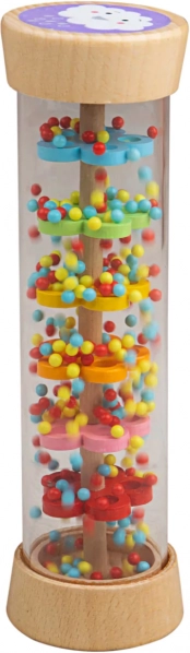 Le cylindre à pluie Bigjigs Baby est un jouet sensoriel qui captive les enfants par son bruissement apaisant et ses couleurs vives. À l’intérieur du cylindre transparent, les billes traversent des disques colorés, imitant une pluie légère. Les deux extrémités sont décorées de jolis motifs de soleil et de nuage, stimulant la perception visuelle.