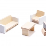 L’emballage contient 16 pièces de mobilier : table, chaises, lit, lampe, fauteuil, canapé, table basse, télévision, piano, banc, transat, parasol, douche, lavabo et toilette.