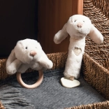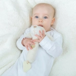 Ce jouet en peluche polyvalent en forme de petit chien offre trois expériences en une : un doux hochet pour stimuler l’ouïe, un pouet amusant lorsque l’on appuie, et un anneau de dentition texturé pour soulager les poussées dentaires. La teinte naturelle neutre s’intègre à toutes les affaires de bébé.