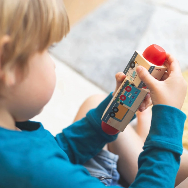 Le jouet est fabriqué en bois de qualité provenant de sources responsables et respecte les normes de sécurité européennes en vigueur. Les enfants peuvent assembler les bonnes correspondances ou mélanger volontairement les images pour créer de joyeuses « nouvelles » machines – la fête ne s’arrête jamais.