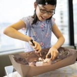 Les enfants dévoilent progressivement les fossiles cachés dans un bloc de plâtre et apprennent la patience ainsi que les bonnes méthodes de fouille. Une expérience réaliste du travail d’exploration à la maison.
