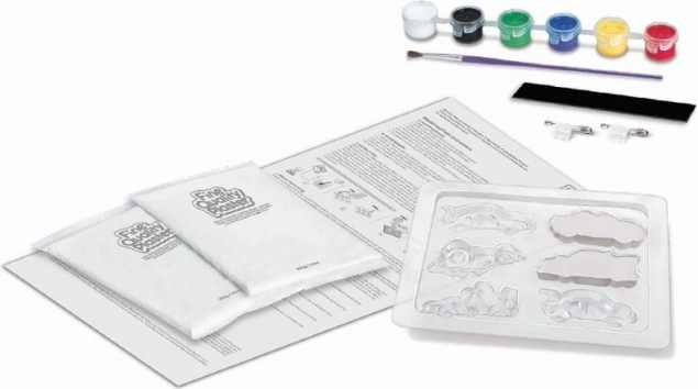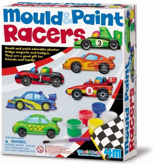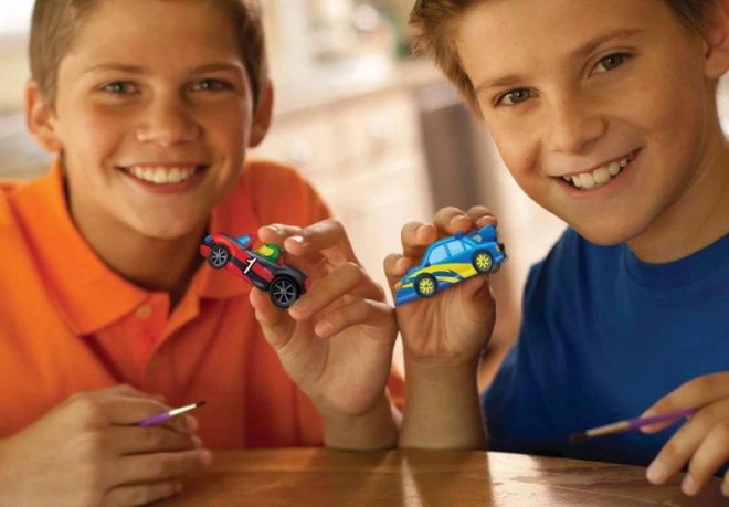 Ce kit permet aux enfants d'exprimer leur créativité et de créer leurs propres voitures de course avec du plâtre et des couleurs.