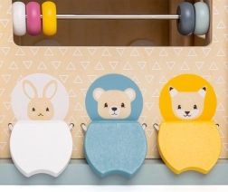 - Activités variées : boîte à formes, piste à billes, roues dentées et d’autres éléments ludiques