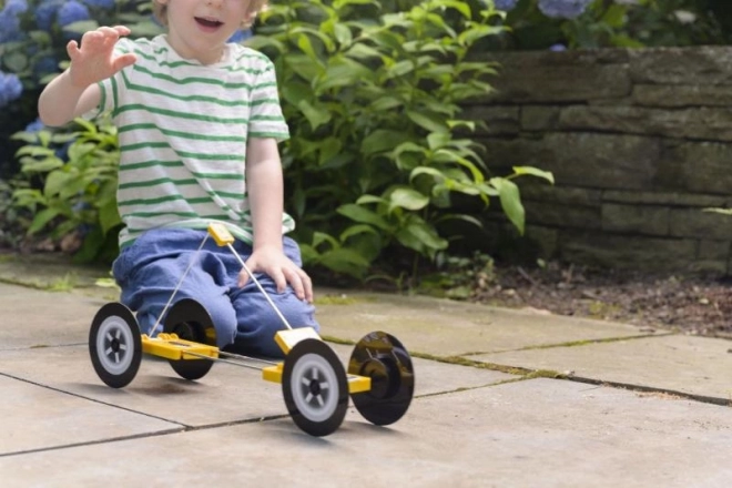 La voiture est fabriquée en plastique léger et résistant, idéale pour une utilisation en extérieur. Son design simple et ses grandes roues noires permettent une manipulation aisée et fournissent le mécanisme d’entraînement au cœur de cet ingénieux dispositif.