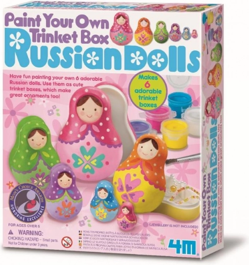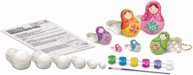 Découvrez la joie de créer avec un kit créatif grâce auquel vous pouvez peindre 6 adorables matriochkas. Les poupées finies serviront de boîtes originales pour les petits objets et en même temps de décorations pour la chambre d’enfant.