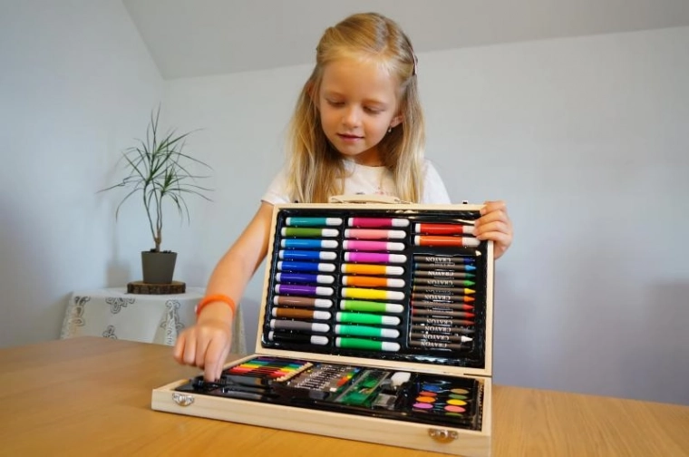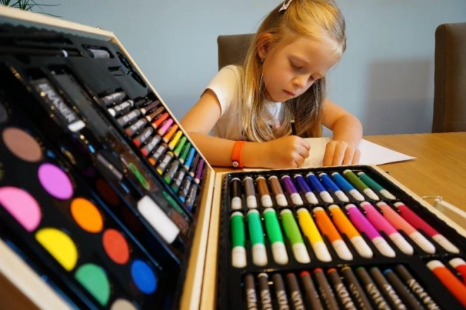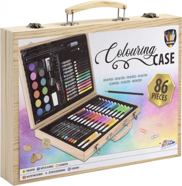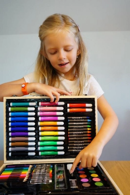 Malette artistique en bois qui ravira tous les peintres et esprits créatifs. La mallette contient 86 pièces : feutres, crayons de couleur, aquarelles, crayons de cire, crayons à papier, règle, gomme...