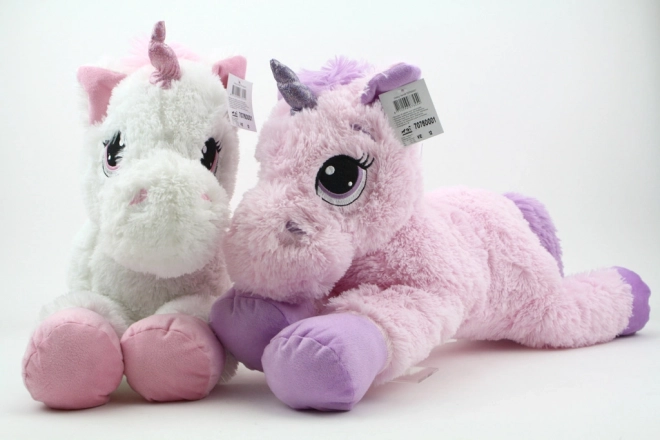 Licorne en Peluche avec une taille de 72 cm fabriqué en peluche de haute qualité, disponible en deux couleurs, blanc et rose.