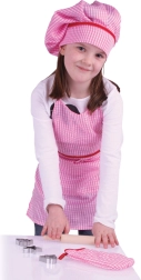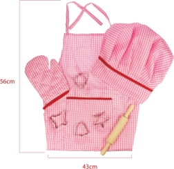 Le coffret comprend tout le nécessaire pour les premières cuissons et pâtisseries : tablier 56 × 43 cm, toque, manique, rouleau à pâtisserie en bois et emporte-pièces. Idéal pour une cuisine enfant et pour la pâtisserie accompagnée.