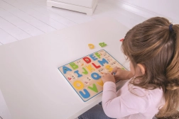 L’insertion des lettres dans leurs découpes précises entraîne la préhension, la coordination œil–main et la capacité de concentration des enfants.
