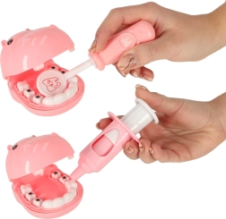 Un set dentaire ludique et pédagogique avec un petit hippopotame aide les enfants à surmonter la peur du dentiste et à adopter une bonne hygiène. Il contient tout ce dont un petit dentiste a besoin : un hippopotame avec dents amovibles, une brosse à dents et du dentifrice, un miroir dentaire, une seringue, une « perceuse », une pince, un scaler et des cartes éducatives.