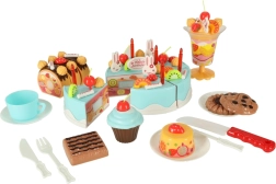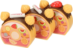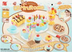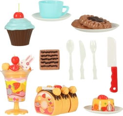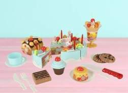 - Contenu du coffret (75 pièces) : 6× part de gâteau, 5× bougie, 14× meringue, 7× bâtonnet sucré, 4× cerise, 4× mandarine, 3× fraise, 3× kiwi, 4× lapin, 1× écriteau, 3× petite assiette, 3× biscuit, 3× tranche de roulé, 3× cupcake, 1× tasse, 1× petite cuillère, 1× fourchette, 1× petit couteau, 1× pelle à gâteau, 1× coupe à glace, ensemble d’autocollants, ensemble d’attaches velcro.