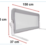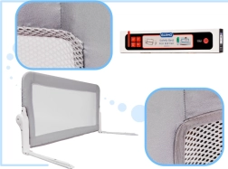 Pratique barrière de lit de sécurité pour enfants de 150 cm de long, en gris élégant, qui empêche les chutes du lit et assure un sommeil calme et sécurisé. Structure métallique robuste, maille respirante pour une meilleure visibilité et charnières pliantes pour rabattre rapidement sous le niveau du matelas. Montage facile sans perçage – il suffit de la glisser sous le matelas.