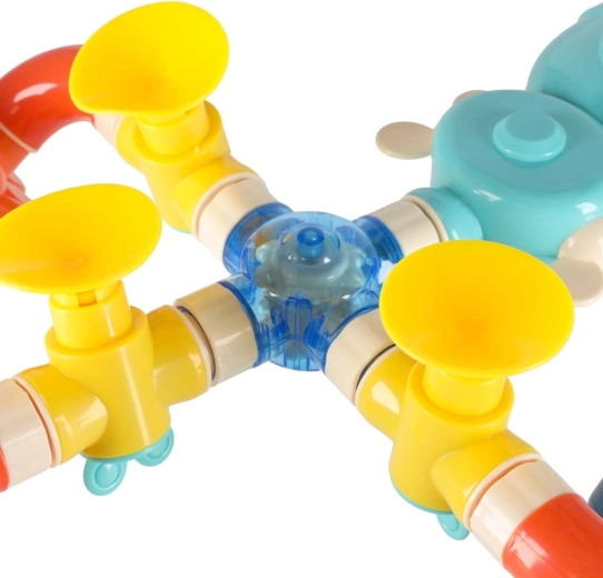 Un kit de bain ludique avec tuyaux et animaux marins transforme chaque bain en jeu créatif. Versez l’eau dans l’entonnoir supérieur et regardez-la circuler à travers les tuyaux, faire tourner les roues et créer des cascades et des petites fontaines. Grâce aux ventouses, le jouet se fixe facilement sur la baignoire ou les carreaux. Il développe la motricité fine, apprend la causalité et stimule la créativité lors de la construction de ses propres parcours d’eau.