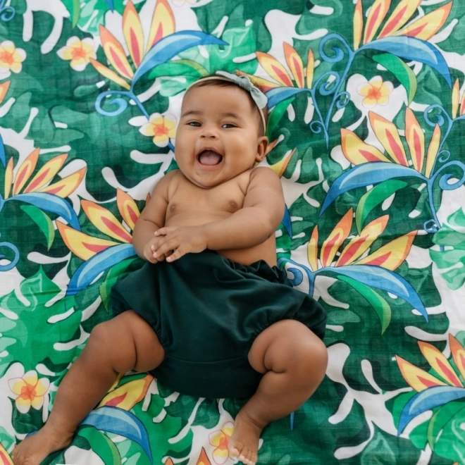Le format généreux 120 × 120 cm permet une utilisation polyvalente à la maison comme en déplacement. Le design stylé Lush Garden attire le regard et complète à merveille un trousseau moderne pour bébé.