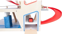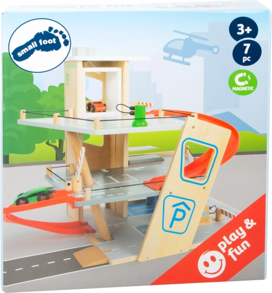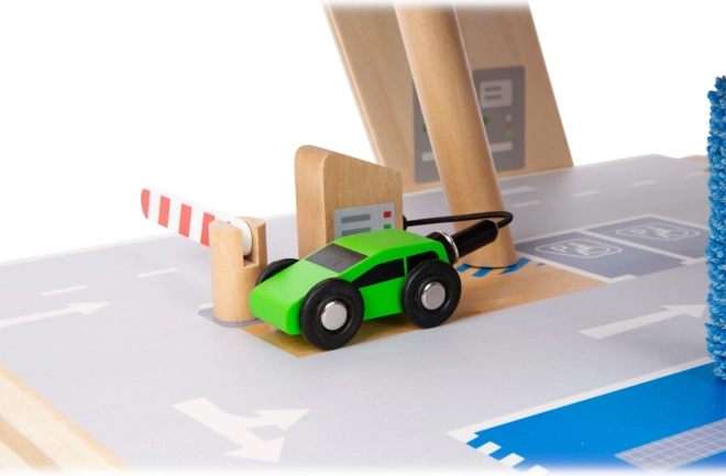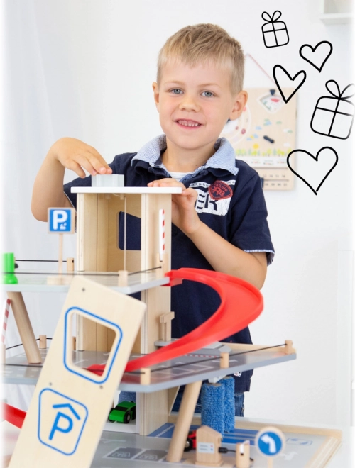 Découvrez un parking en bois robuste sur trois niveaux, avec un ascenseur fonctionnel et des rampes fluides pour des jeux de voitures sans fin. Inclus: deux voitures, une station-service, une borne de recharge pour véhicules électriques, une rampe élévatrice, un lave-auto avec brosses et des barrières mécaniques à chaque étage. La barrière en caoutchouc assure une conduite sûre et le marquage détaillé développe la connaissance du code de la route.