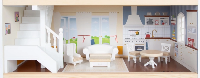 La maison de poupées a une façade extérieure lumineuse, un design moderne et des éléments fonctionnels comme des portes coulissantes et des fenêtres ouvrables.