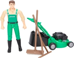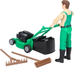 - Figurine de jardinier, tondeuse avec bac amovible, râteau, balai