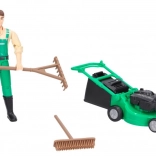 Figurine de jardinier, tondeuse avec bac amovible, râteau, balai