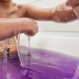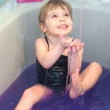 Glibbi transforme le bain en slime violet pailleté, offrant aux enfants une sensation totalement nouvelle du bain quotidien.