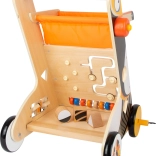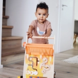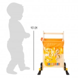 Ce chariot au design coloré propose différentes activités sur trois faces, dont des formes à encastrer, un boulier et un labyrinthe coulissant. Les roues avant sont équipées de « petites pattes » qui émettent un son amusant en mouvement, ajoutant une touche de divertissement. Un panier de rangement, facile à entretenir, constitue un accessoire pratique.