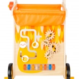 Le chariot comprend divers éléments ludiques tels que des formes à encastrer, des labyrinthes et des engrenages, qui favorisent le développement de la motricité fine.