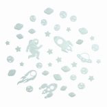 Avec cet ensemble spatial, vous créez facilement un ciel nocturne féerique directement dans la chambre des enfants. Il suffit d’exposer les décorations à la lumière et leur effet phosphorescent assure une douce lueur qui stimule l’imagination et favorise un endormissement paisible.