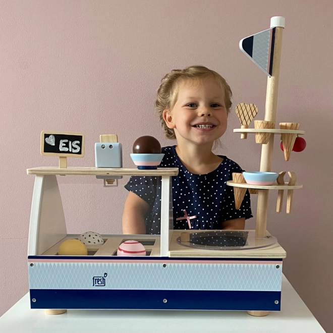 Le set comprend huit parfums de glace différents, dont vanille, chocolat, stracciatella et fraise. Des éléments interactifs, tels que des supports pour cornets, une vitrine en plastique et un congélateur avec couvercle transparent, intensifient encore l’expérience de jeu.