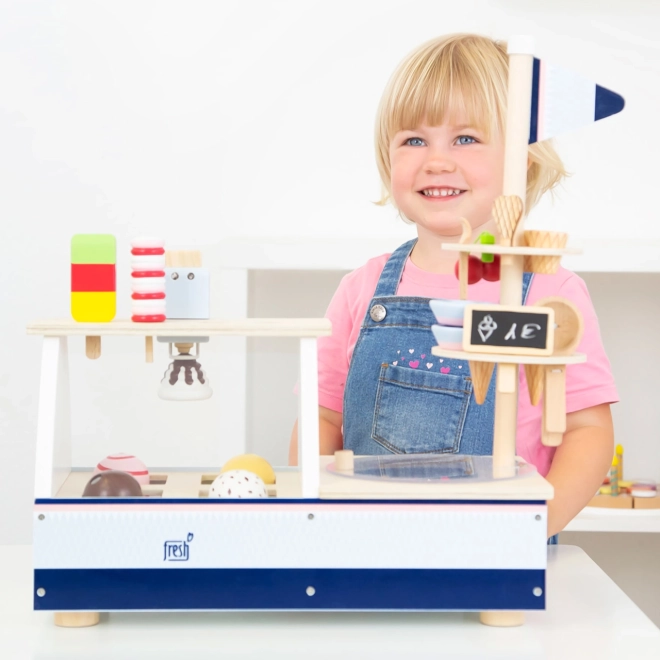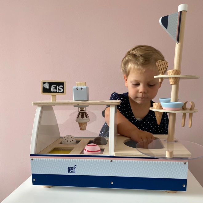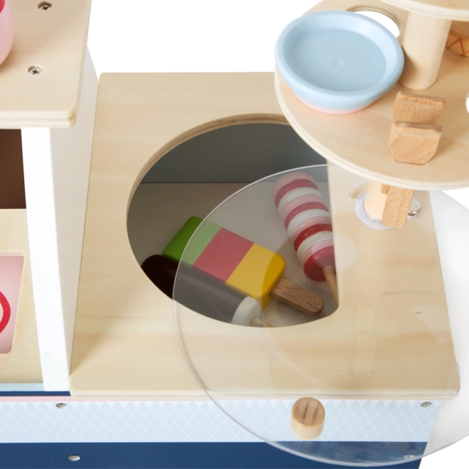 Une vitrine transparente et un congélateur permettent un jeu réaliste et la présentation des glaces.