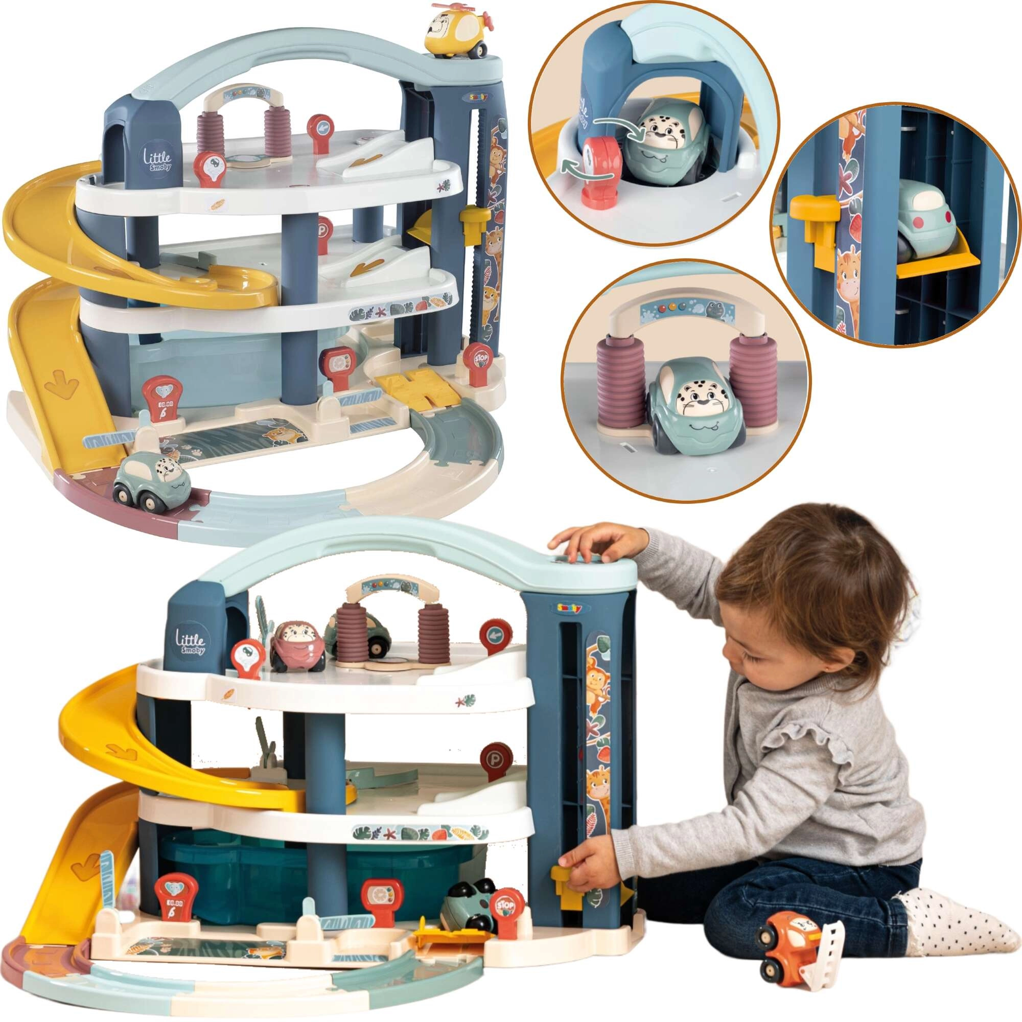 Découvrez le garage Little Smoby à trois étages robuste avec méga rampe, ascenseur fonctionnel, lave-auto, station-service et héliport. Le coffret comprend une petite voiture et un hélicoptère. Grâce à la poignée pratique, le garage se transporte facilement et dispose d’un espace de rangement caché pour les petites voitures. Cadeau idéal pour les enfants à partir de 18 mois, fabriqué en France.
