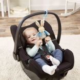 L’anneau bleu permet une fixation rapide sur la poignée de la poussette, l’arceau du siège auto ou au-dessus du lit bébé.