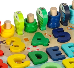 Jouet éducatif en bois coloré 3-en-1 combinant trieur de formes et de chiffres, boulier et jeu de pêche magnétique. Il favorise l’apprentissage des couleurs, des formes et des chiffres, développe la motricité fine, la concentration et la patience. Des pièces en bois de qualité aux bords lisses, sûres pour les enfants, invitent à découvrir en jouant.