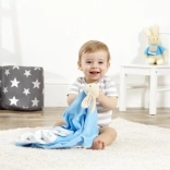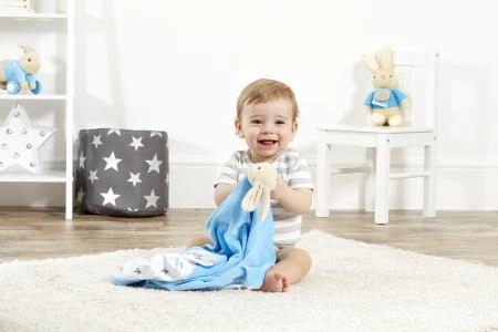 L’extérieur bleu et l’imprimé intérieur d’illustrations inspirées de Beatrix Potter font de ce doudou un compagnon stylé.