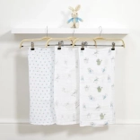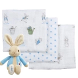Magnifique ensemble cadeau comprenant 3 couches en mousseline et un lapin en peluche Pierre. Les couches sont fabriquées en 100% coton, lavables et chacune a un imprimé différent.