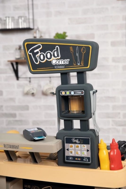 La partie cuisine pour préparer les plats et le comptoir de service avec caisse et terminal de paiement favorisent un jeu de restaurant réaliste.