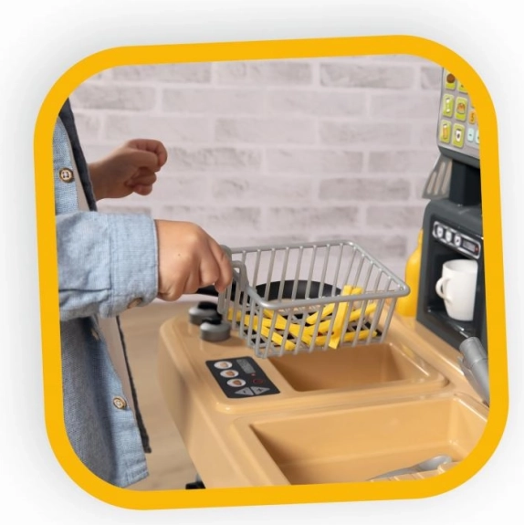 Le set séduit par une multitude de détails : plaque de cuisson, friteuse, évier avec robinet, four, réfrigérateur, distributeur de boissons, machine à café et crochets de suspension pour les ustensiles. Sont également inclus un terminal de paiement, des reçus, une carte bancaire et un menu imprimé. Après le jeu, les restes peuvent être « rangés » dans la poubelle. Au total, 29 accessoires encouragent des scénarios de jeu de rôles riches et la motricité fine.