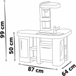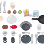 Elle comprend un riche ensemble de 34 accessoires – casserole avec couvercle, poêle à crêpes, moulin à sel et poivre, vaisselle et couverts pour deux personnes, capsules pour la machine à café, ustensiles de cuisine, panier pour le lave-vaisselle et aliments factices. Les boutons rotatifs, les portes du four et du réfrigérateur ouvrantes et le son typique « cric cric » de la machine à soda favorisent un jeu réaliste.
