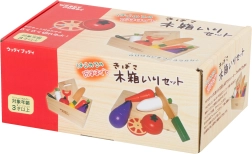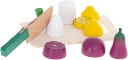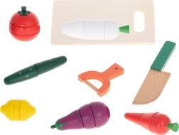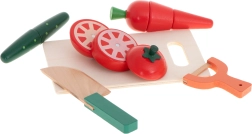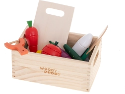carotte, persil (radis), concombre, tomate (avec tranches), citron, aubergine, planche à découper, couteau sécurisé, éplucheur sécurisé, caissette en bois