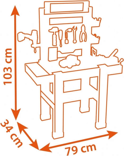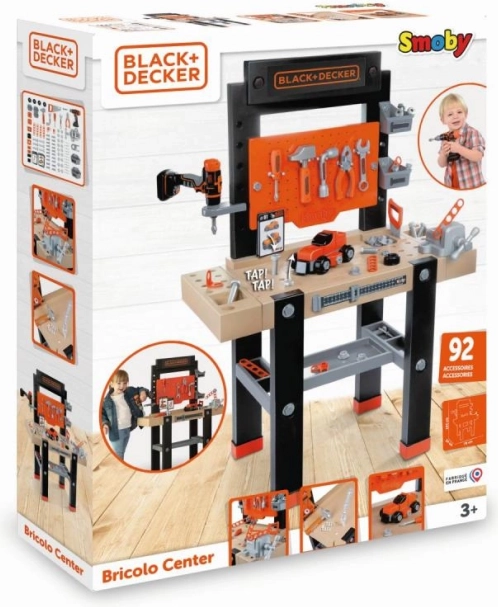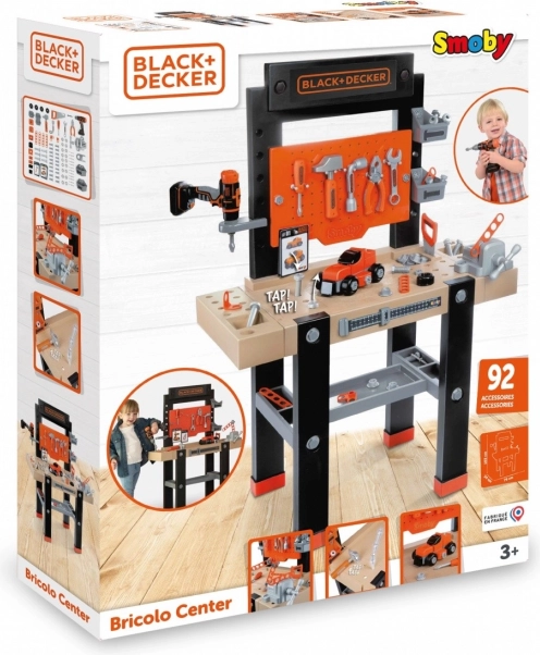 Le grand établi pour enfants BLACK+DECKER Bricolo Center de Smoby offre un atelier réaliste avec 92 accessoires. Vous y trouverez une perceuse mécanique, un étau, des tournevis, un marteau, une scie, des pinces ainsi qu’une petite voiture à assembler. Sa construction stable, ses espaces de rangement pratiques et ses dimensions 103 × 79 × 34 cm favorisent le développement de la motricité et de la créativité des enfants dès 3 ans.