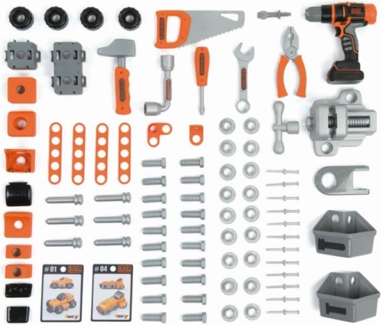 - Établi, perceuse/visseuse mécanique, tournevis, marteau, scie, pinces, clé, étau, vis, écrous, clous, lattes de construction, petite voiture à assembler, 2 paniers, 2 extensions latérales