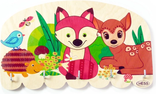 Porte-manteau en bois design avec motif d’animaux de la forêt pour clés, bijoux et petits objets. Il offre 5 crochets métalliques, est peint à la main et fabriqué en Allemagne. Installation facile grâce aux trous pré-percés.