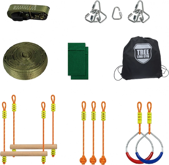 Le parcours d'obstacles Ninja 2Kids Toys est basé sur une sangle en nylon durable, qui peut être tendue entre deux arbres à l'aide d'un cliquet métallique robuste. Différents types d'obstacles peuvent être suspendus à la sangle en utilisant des mousquetons. Cette variabilité permet d'atteindre divers niveaux de difficulté et assure un entraînement amusant pour chacun. En outre, le parcours peut également être utilisé pour le slackline.