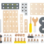 Le coffret comprend de nombreux accessoires: lattes et plaques de construction avec trous pré-percés, blocs, roues, adaptateurs de roues, entretoises et deux outils en bois – clé et tournevis. Le tout se range de manière claire dans une boîte pratique, pour que rien ne se perde.