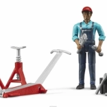 Figurine de mécanicien, outillage d’atelier (marteau, tournevis, cric, etc.)