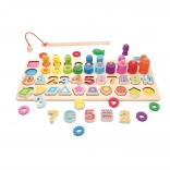 Le jeu comprend différents éléments que les enfants peuvent utiliser pour pêcher, assembler des chiffres ou empiler des anneaux. Toutes les pièces sont conçues pour être facilement saisies par de petites mains, ce qui soutient leur autonomie et leur exploration créative.
