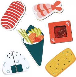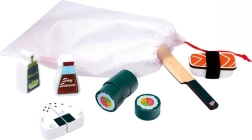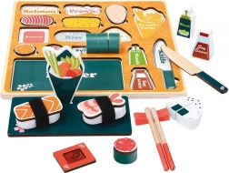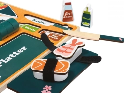 L'ensemble comprend des composants en bois comme des sushis, des sauces, des ustensiles et un couteau pour "couper", permettant un jeu réaliste et créatif. Ce jeu convient aux enfants de plus de 36 mois, mais il est recommandé qu'un adulte surveille les enfants de moins de 3 ans.
